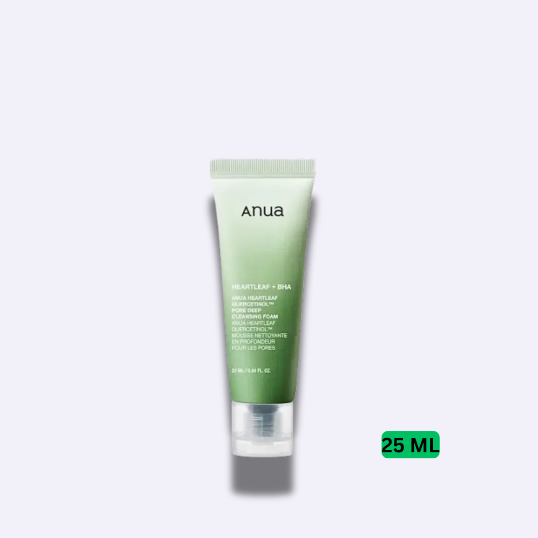 The Anua Heartleaf Quercetinol Pore Deep Cleansing Foam 25ml is a travel-sized foaming cleanser formulated with BHA (beta hydroxy acid) for gentle exfoliation. It is recommended for combination-to-oily and acne-prone skin types, and also for sensitive skin